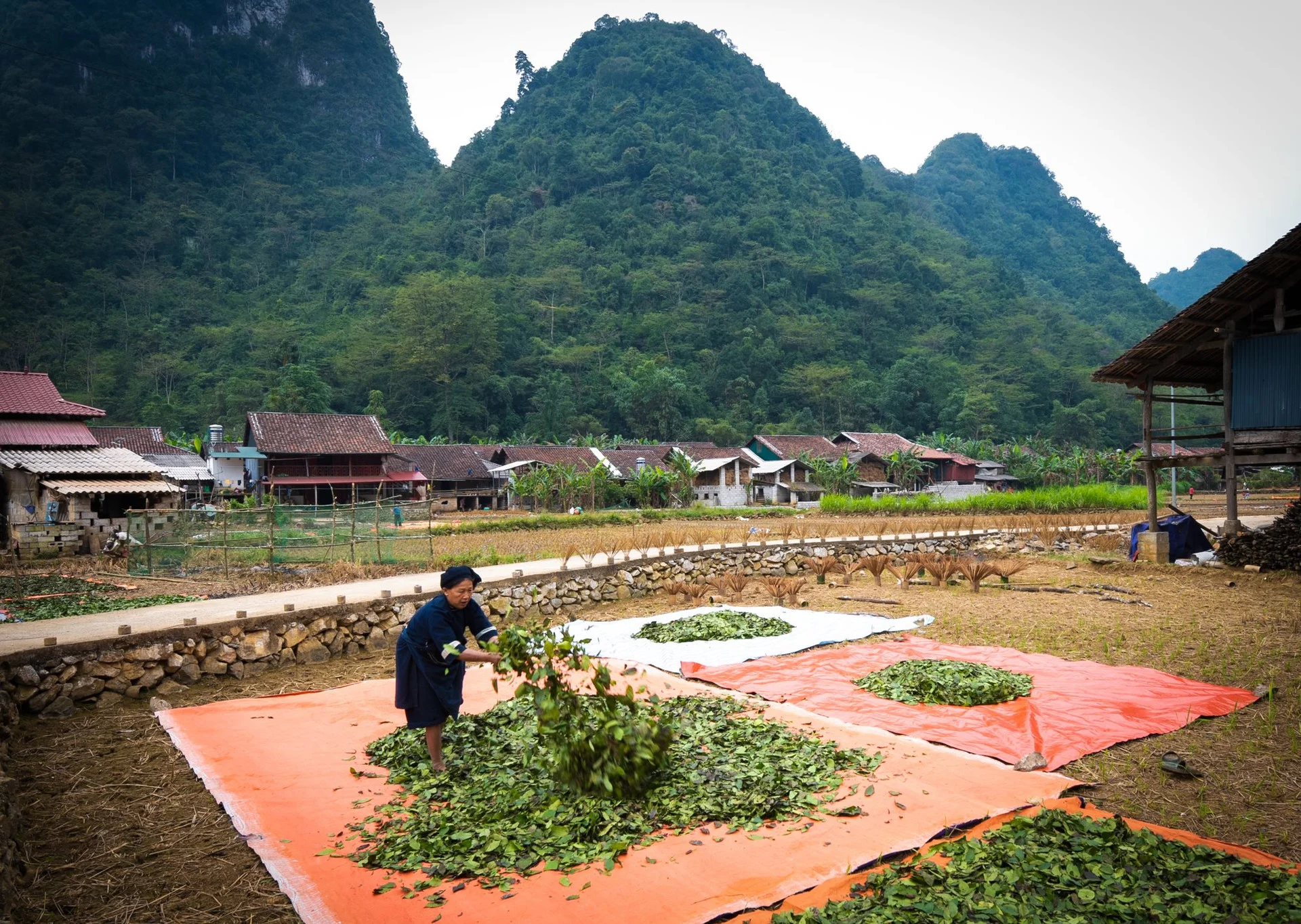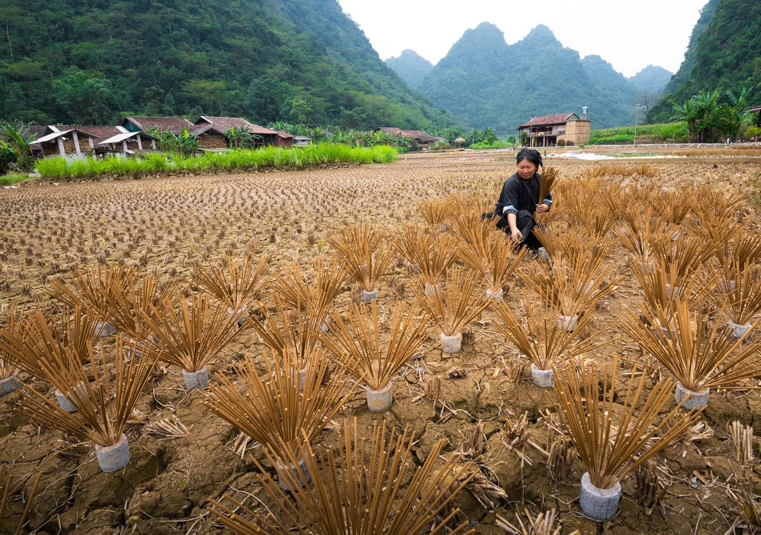 Once the incense is rolled, it cannot be kiln-dried or machine-finished. The Nùng An people use every available surface — rice paddies after harvest, pathways into the village, and stone trays beneath the stilt houses — to dry the sticks in the open air. A sunny day dries them in hours; a cloudy stretch can mean three days of waiting. Walking through Phia Thap Village during drying season, with bundles of incense fanning out in every direction, is one of the most visually arresting experiences in northern Vietnam.